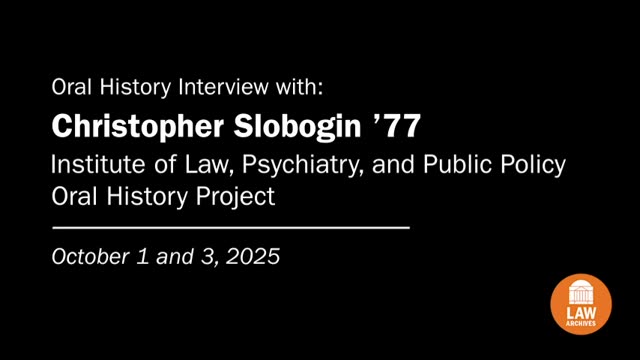 Oral history interview with Christopher Slobogin, class of 1977, regarding his work as ILPPP’s second mental health law fellow. Slobogin discusses the founding years of the institute, his work with the Western State Hospital and Forensic Psychiatry Clinic in the late 1970s, and the impact of ILPPP on his scholarship and career.